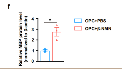 老实说,到这里已经是一篇不错的文章了,但是,为什么不一口吃成个胖子呢?实验决定把NMN提升NAD+的具体功效作为重点研究对象,结果发现NMN能在培养液中大幅提升髓鞘基础蛋白(MBP)。
